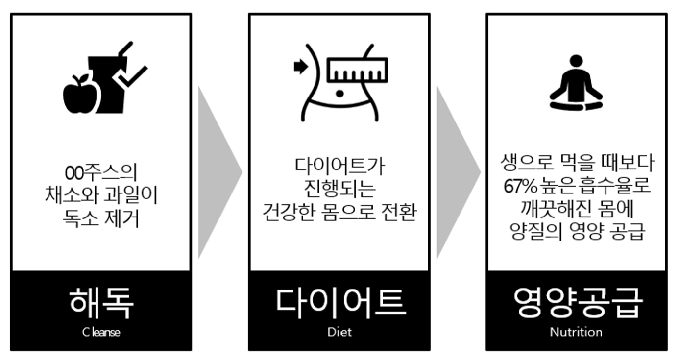 위 예시처럼 '해독 → 다이어트 → 영양공급'이라는 3단계 프로세스를 간단한 아이콘과 화살표로 표현하면, 긴 문장보다 훨씬 빠르고 명확하게 의미를 전달할 수 있습니다.
