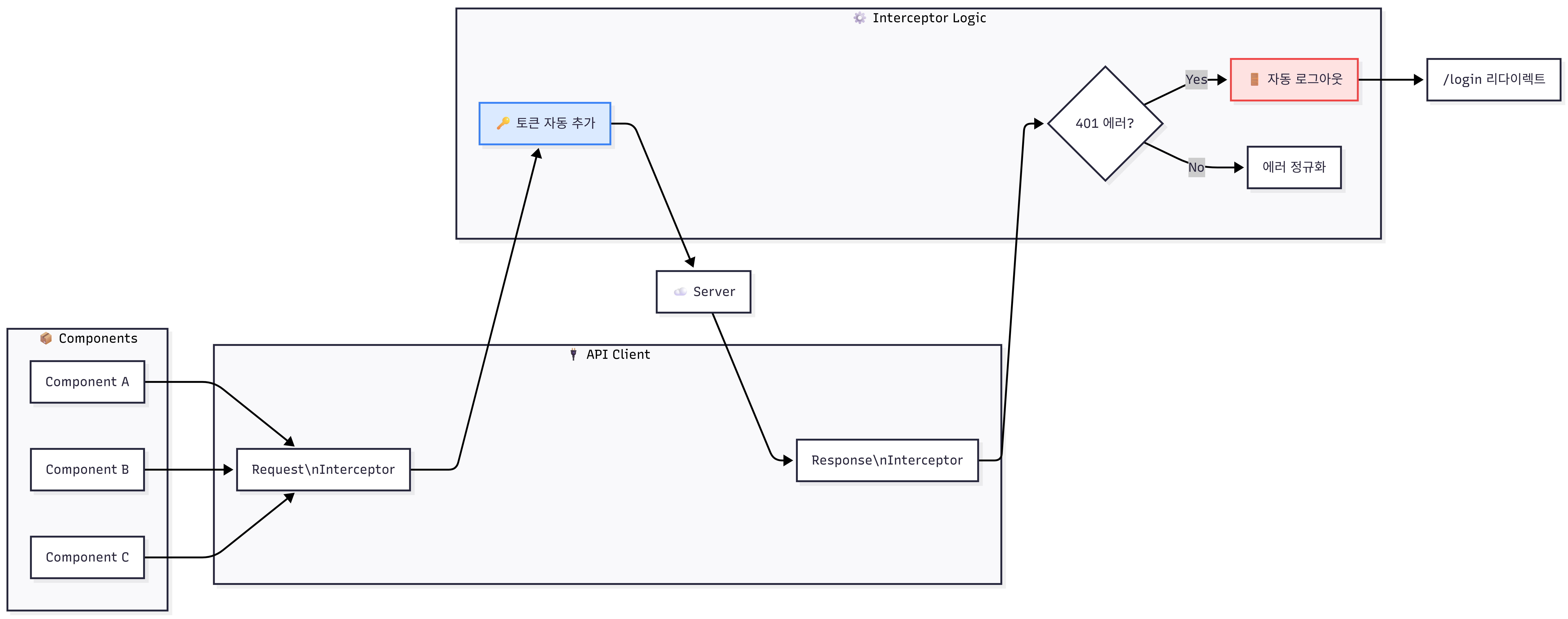 이 패턴으로 모든 API 호출에 대해 일관된 에러 처리가 가능해졌고, 각 컴포넌트에서 반복적인 401 처리 코드를 제거할 수 있었습니다.